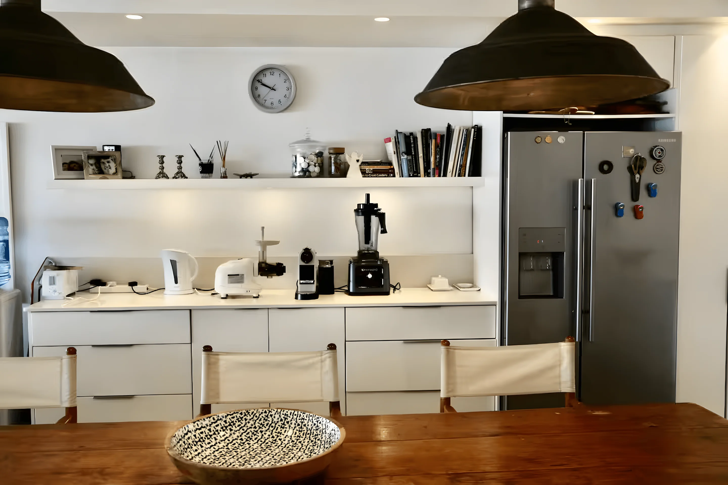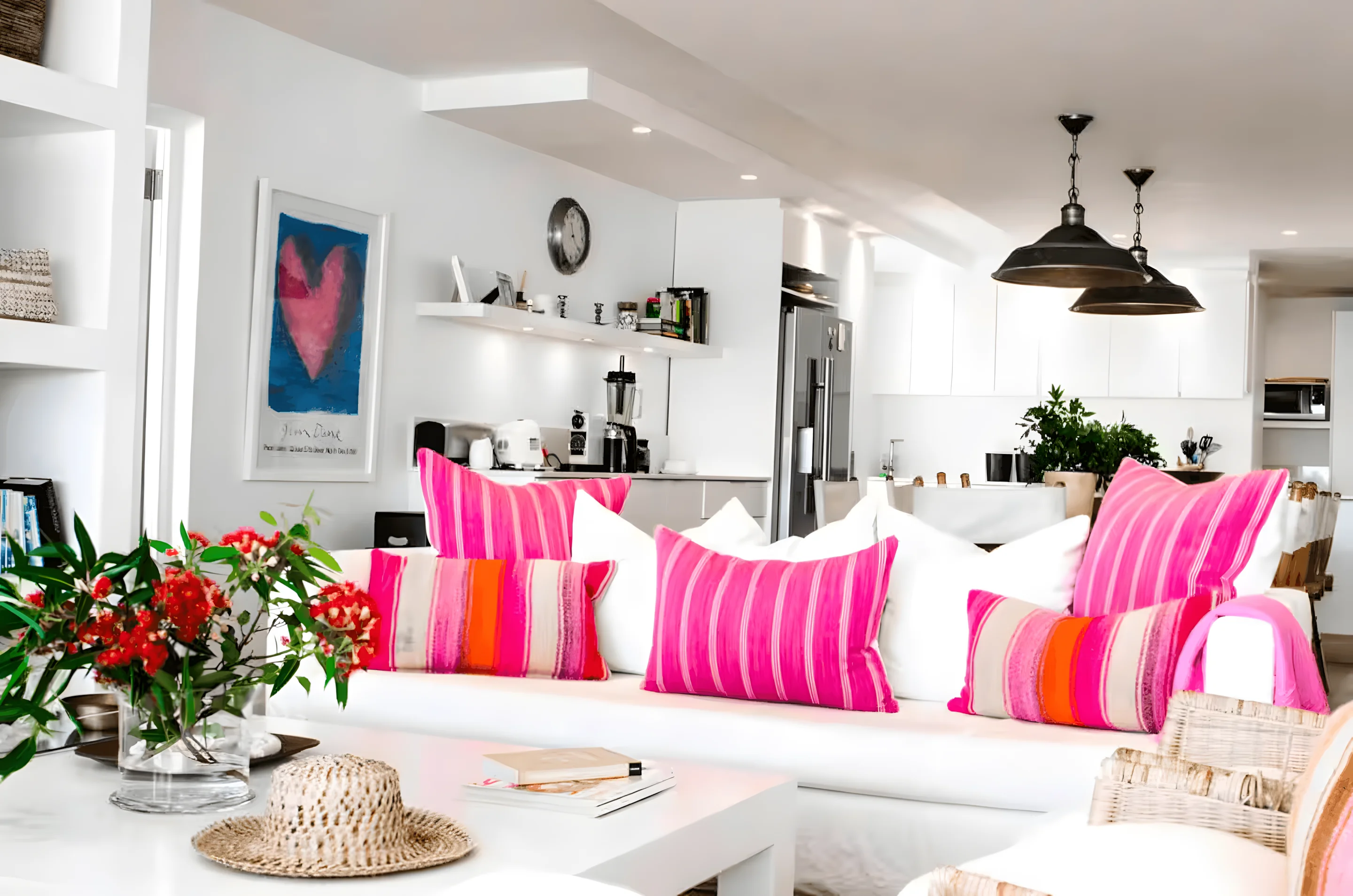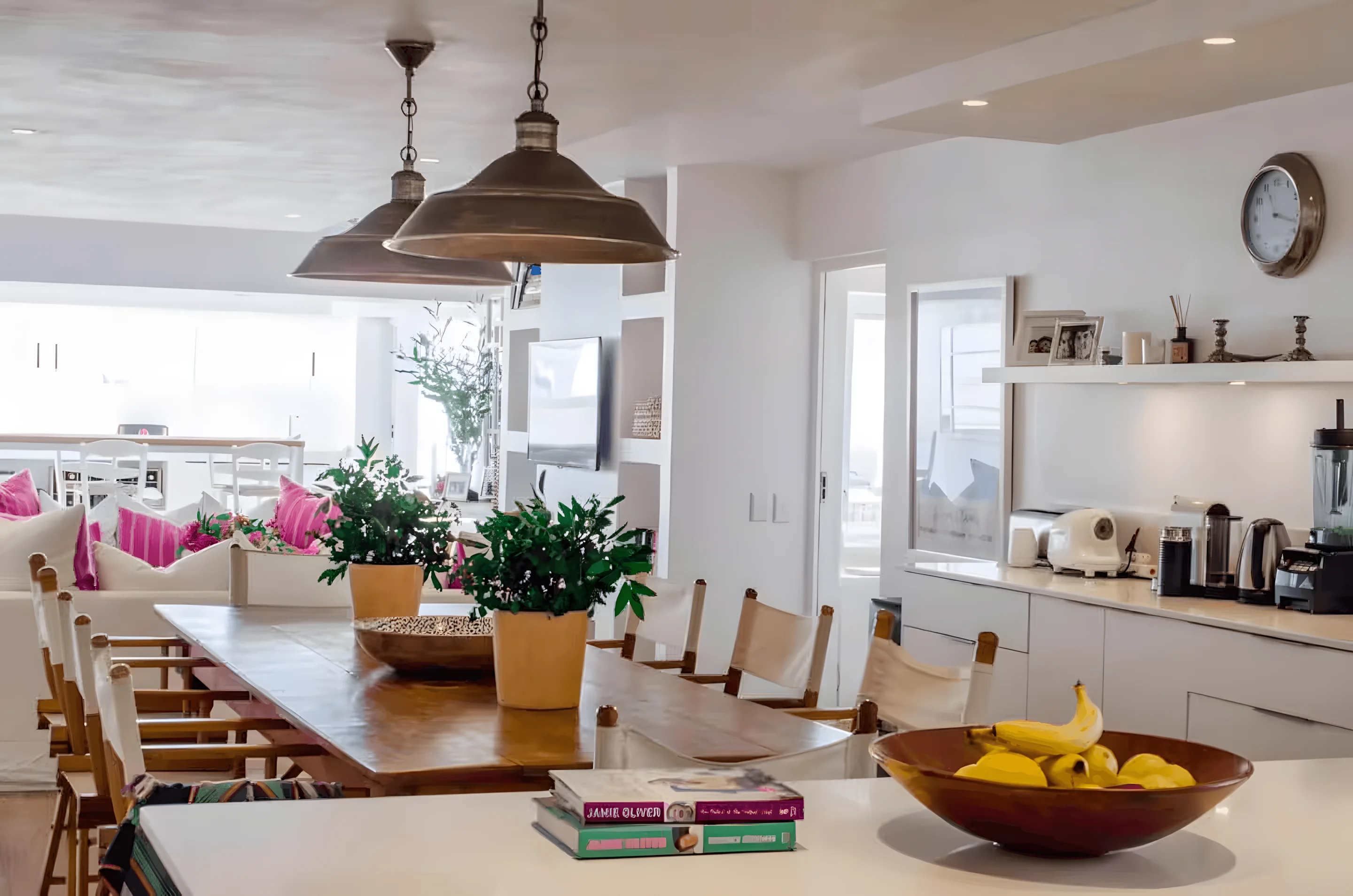 Inside, the light-filled open-plan lounge, dining area, and fully equipped kitchen create a