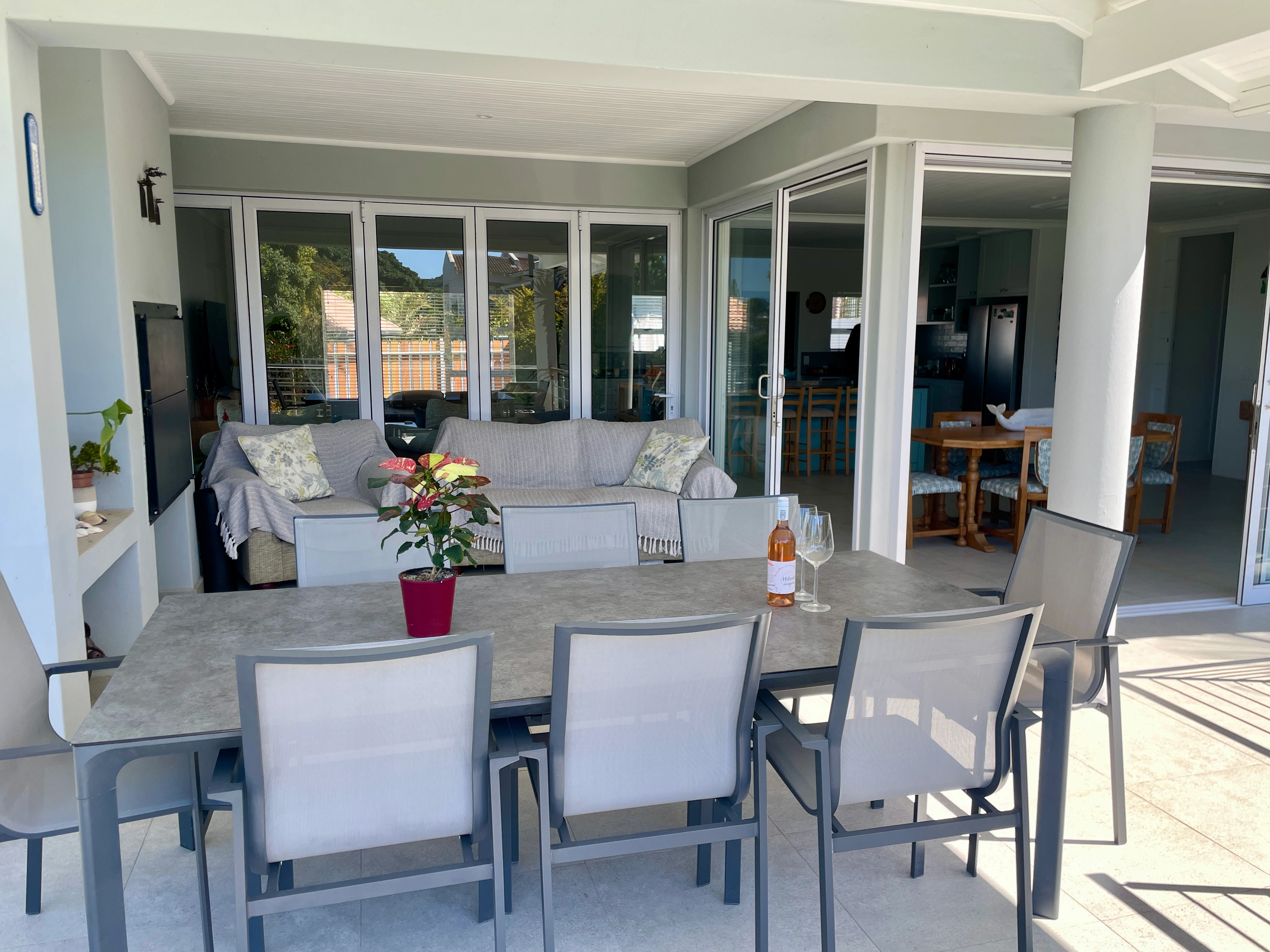 The open-plan living area features a lounge, dining space, and kitchen with dishwasher, microwave, washing machine, and tumble dryer. Enjoy the Bluetooth sound bar, HD TV with DSTV/Netflix access via your own accounts, and a convenient kitchen-counter workspace. Outside, relax on the patio with a built-in fireplace and charcoal braai.