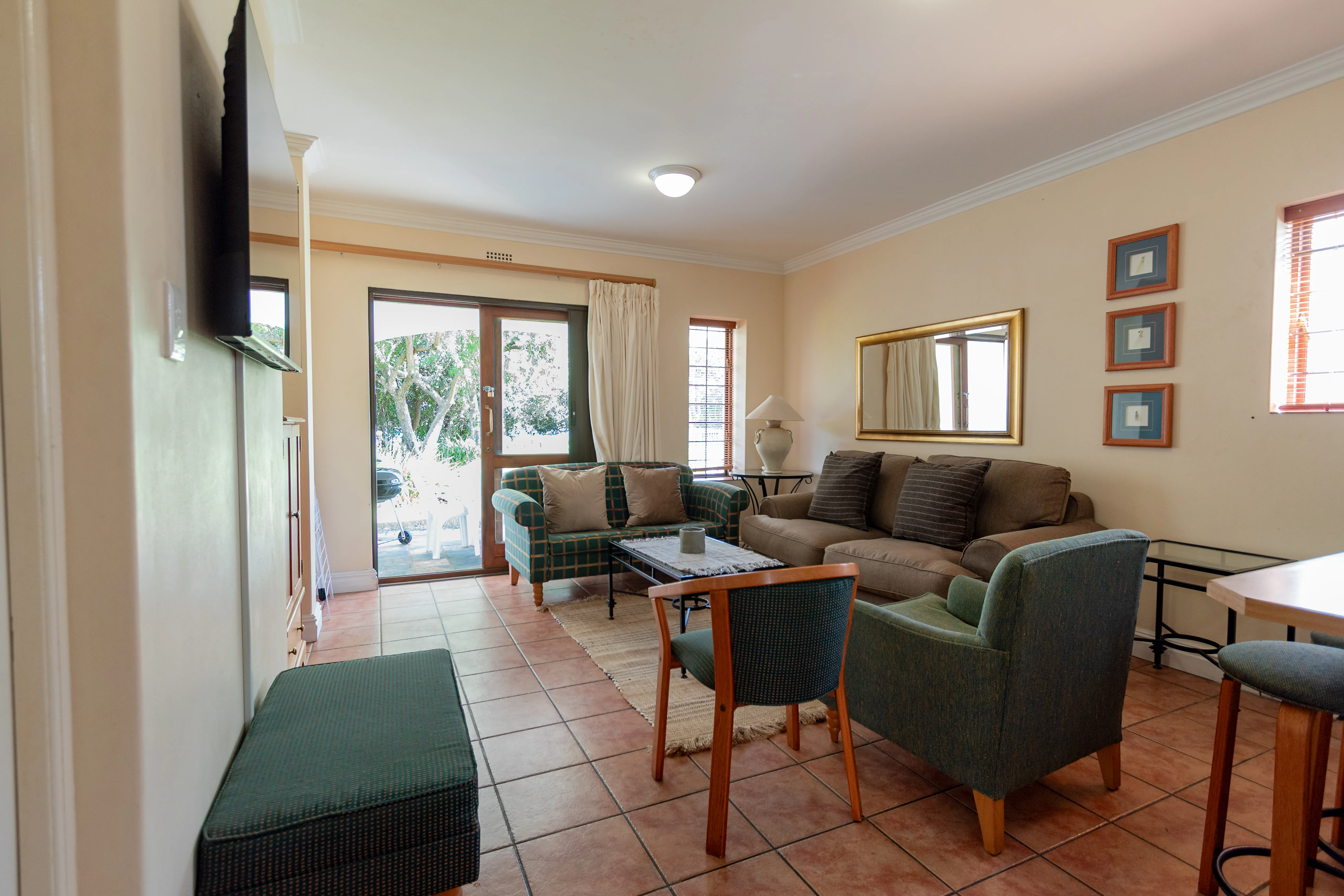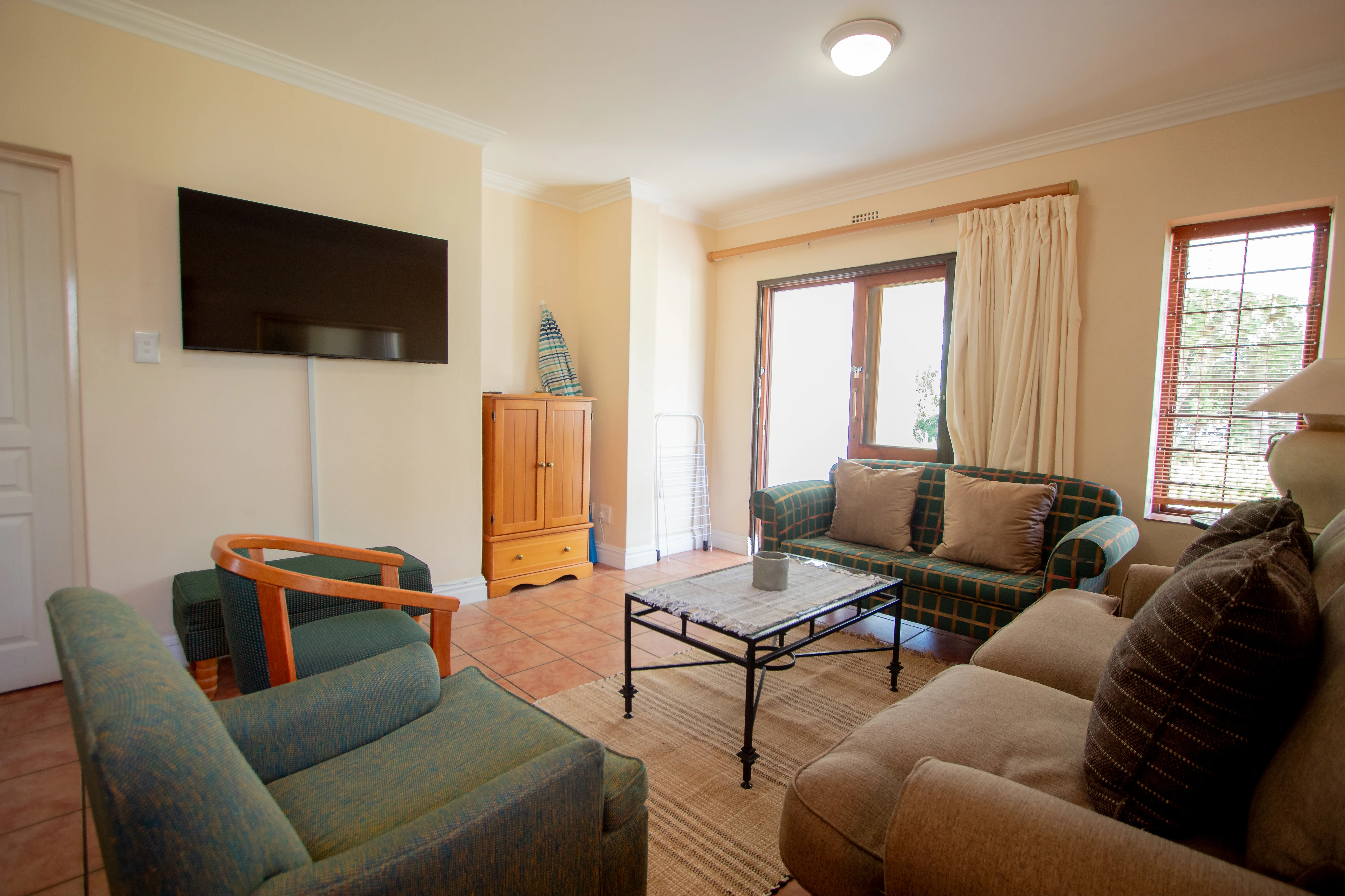 Step into a relaxed open-plan living space with comfortable seating, an HD Smart TV (streaming ready), and sliding doors opening onto a sunny Weber braai patio with outdoor dining furniture—perfect for sunset views over the surrounding gardens.