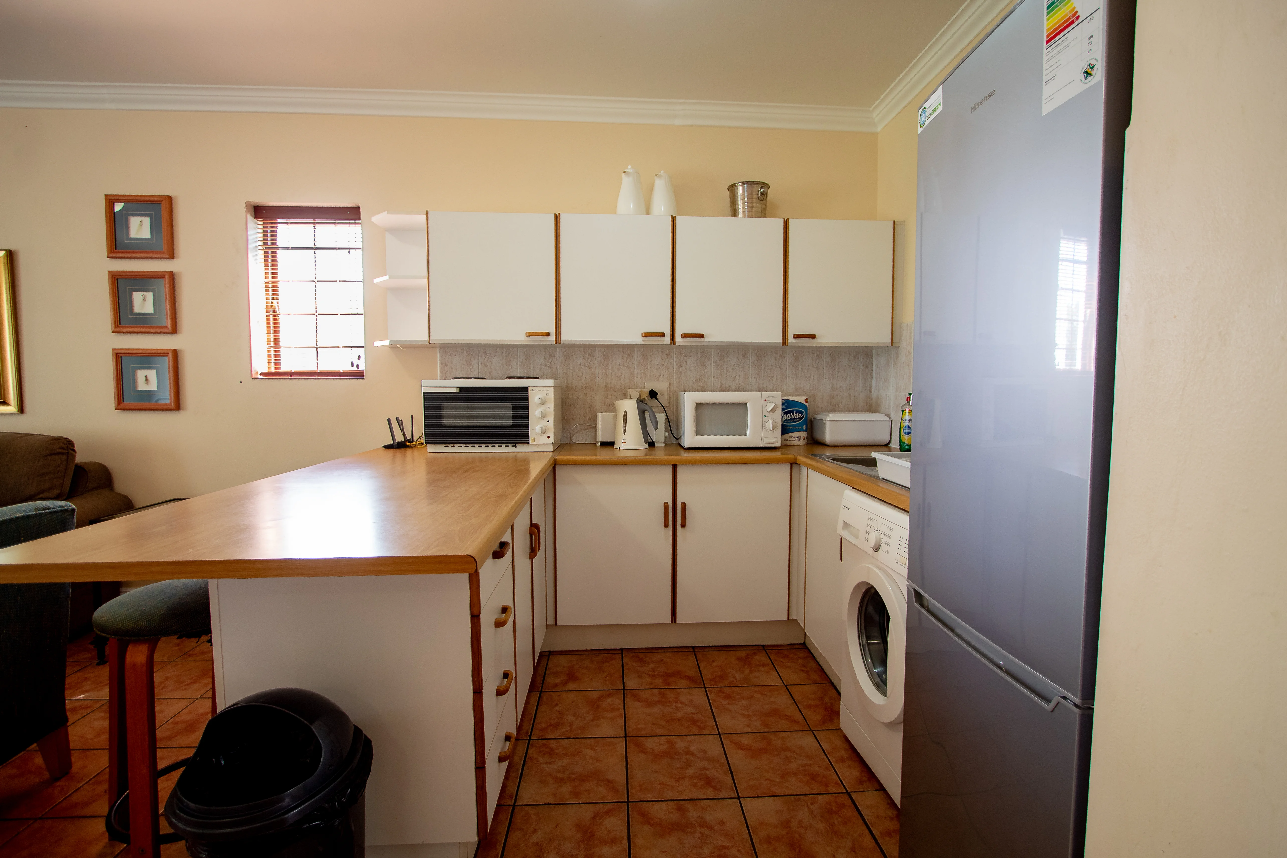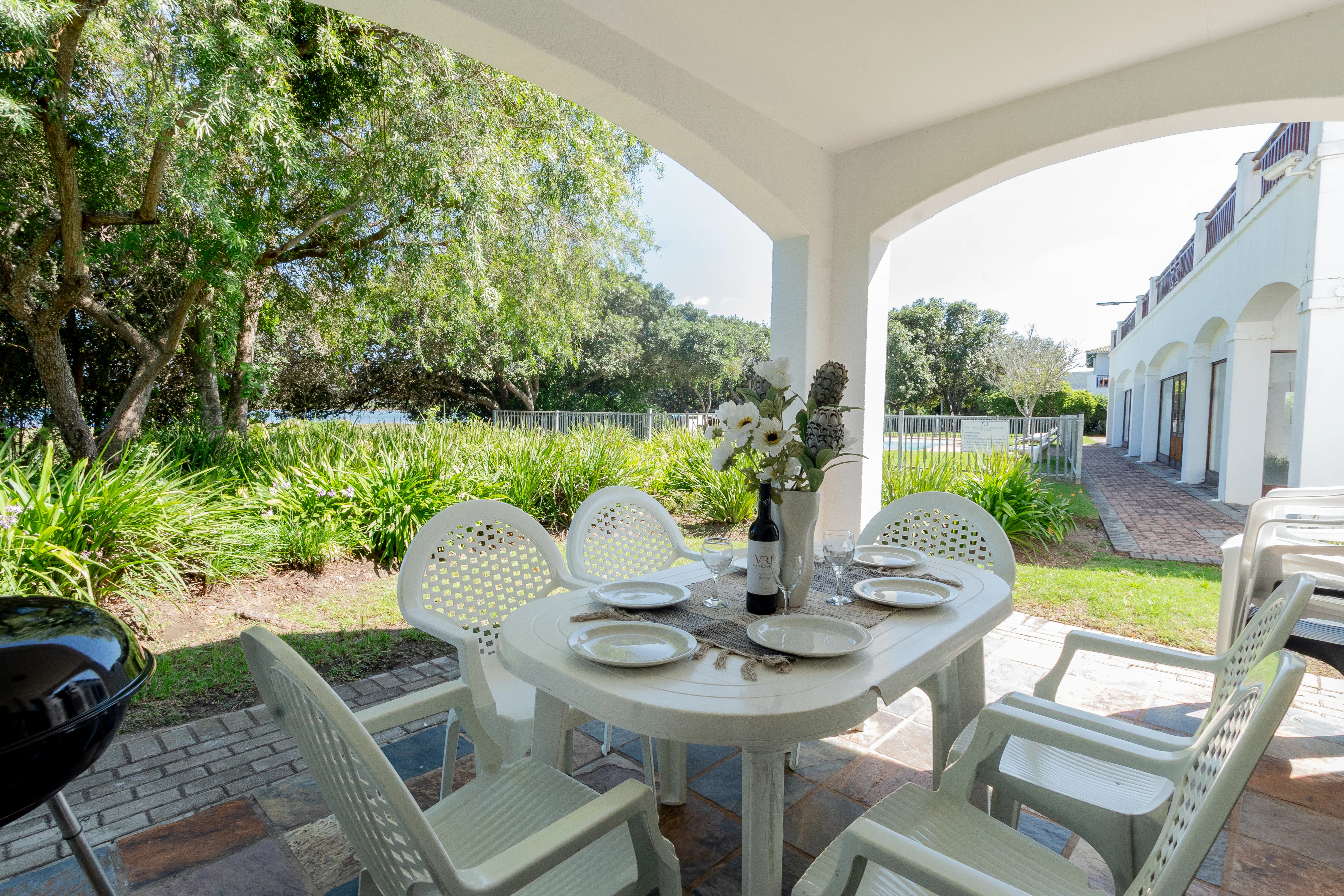 The apartment offers a small kitchen, open-plan living area, and a private patio with outdoor furniture and a Weber braai, perfect for relaxed evenings surrounded by greenery, with the river just beyond the thicket of bush in front of the apartment.