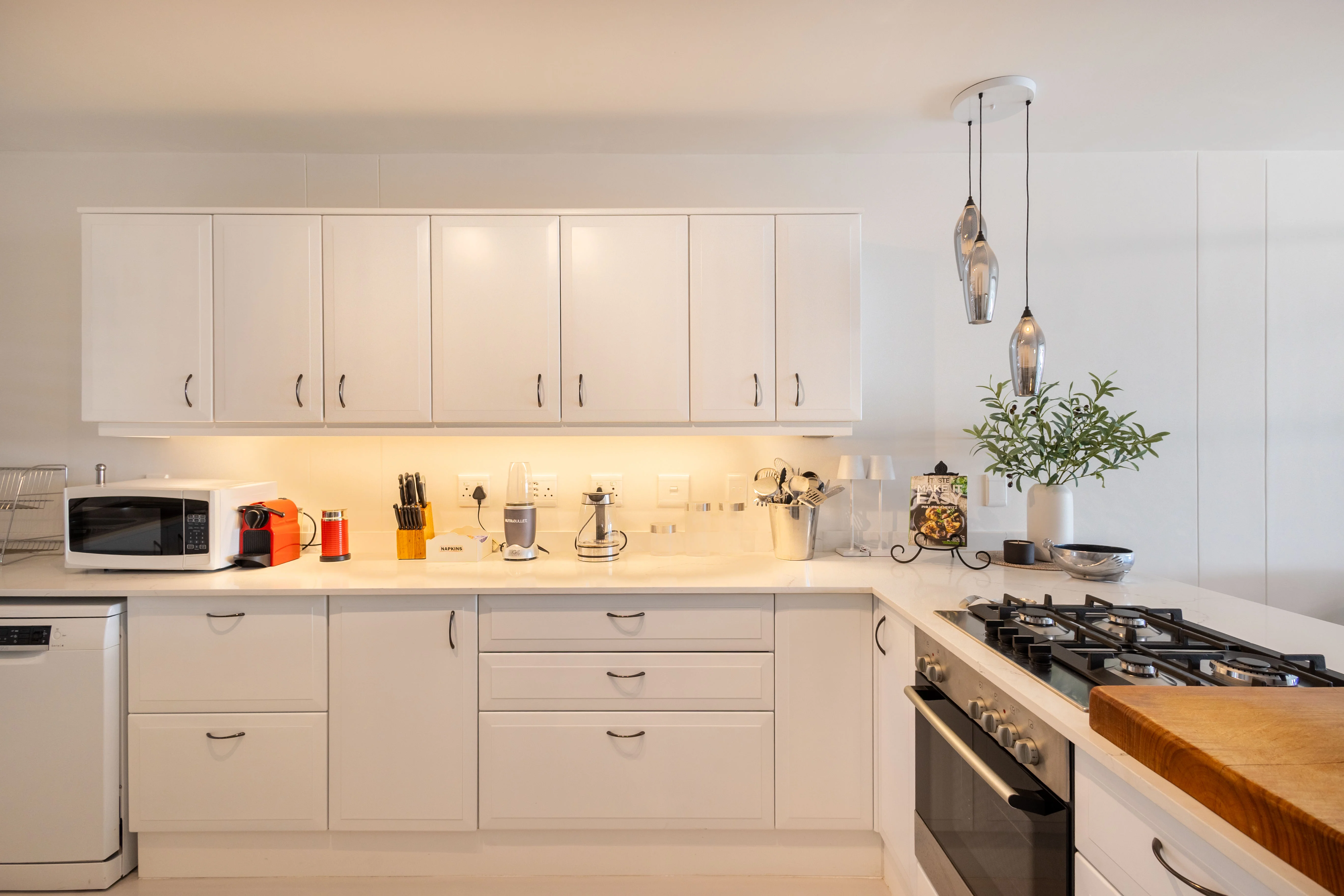 The fully equipped kitchen includes a gas stove, oven, refrigerator, freezer, dishwasher, microwave, toaster, and Nespresso machine. Cooking essentials and a starter kit (coffee, tea, sugar, milk, water) are provided. A Whirlpool washing machine, drying rack, iron, and cleaning supplies are also available for your convenience.