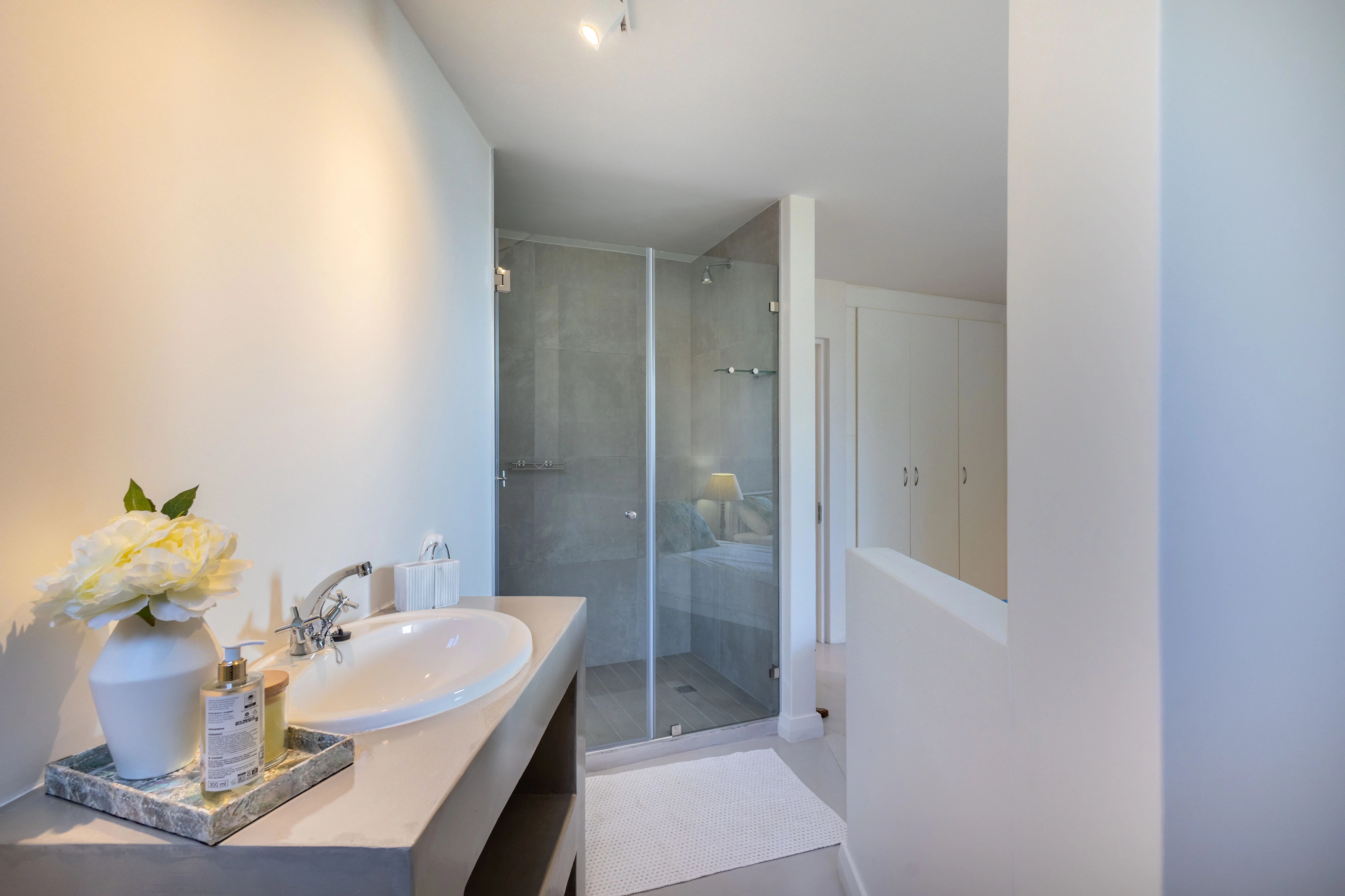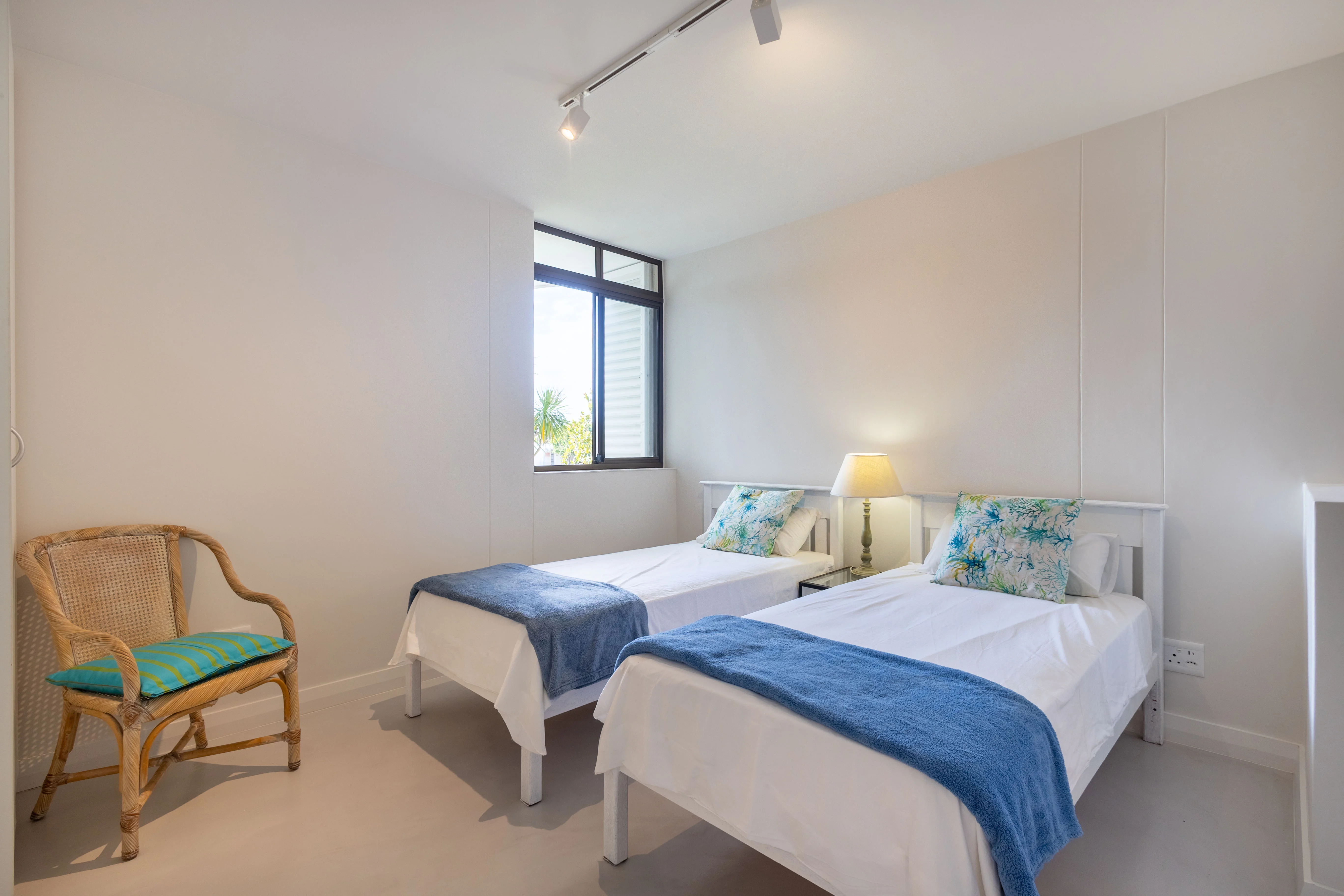 Each bedroom features an en-suite bathroom, comfortable bedding with fresh linen, and ample clothing storage. The main bedroom offers a king bed and dressing room, while the other two bedrooms include single beds with ¾ duvets. Room-darkening shades and warm blankets are provided for added comfort.