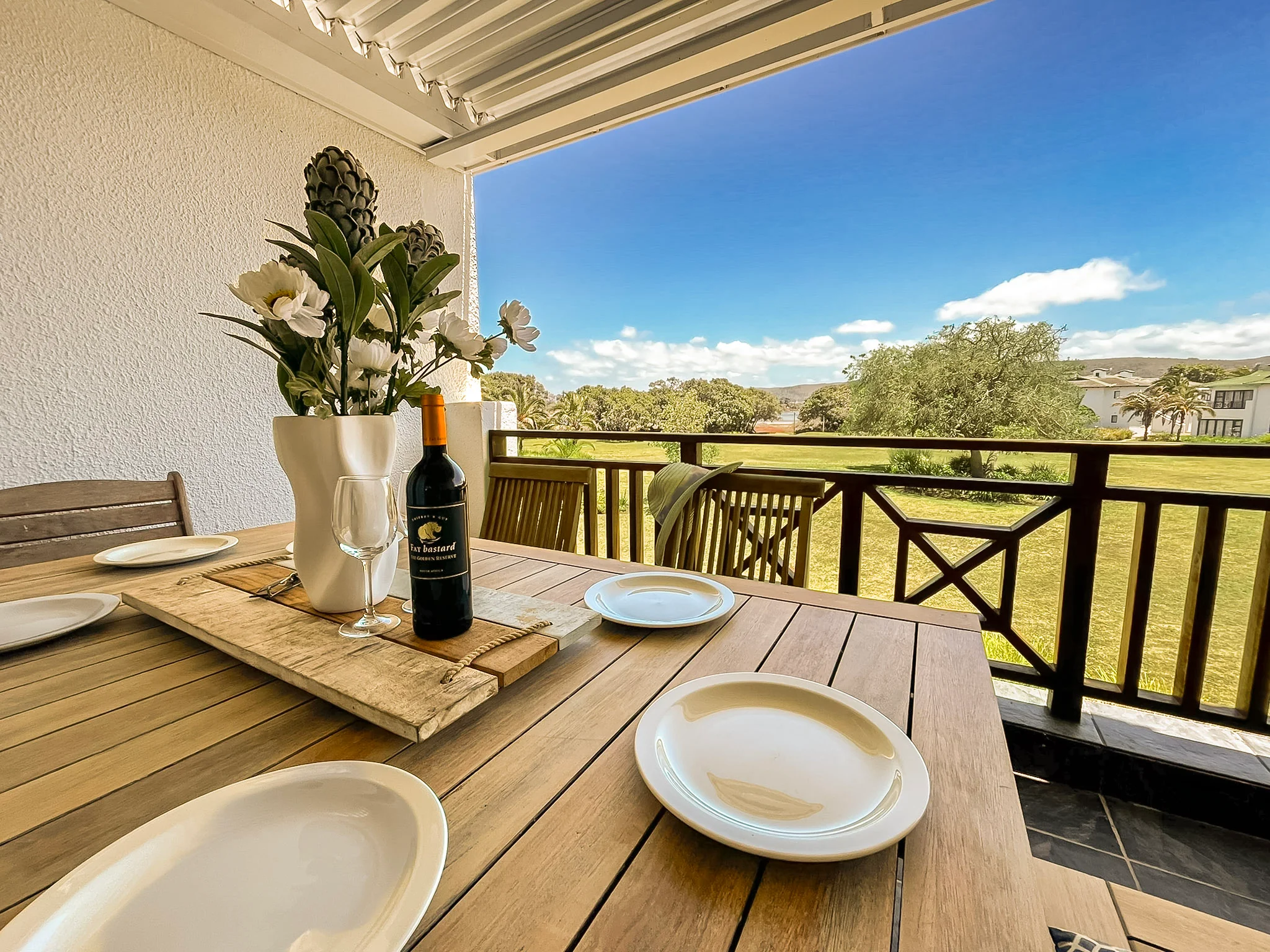 balcony dining with garden views and glimpses of the river through the trees. Just steps