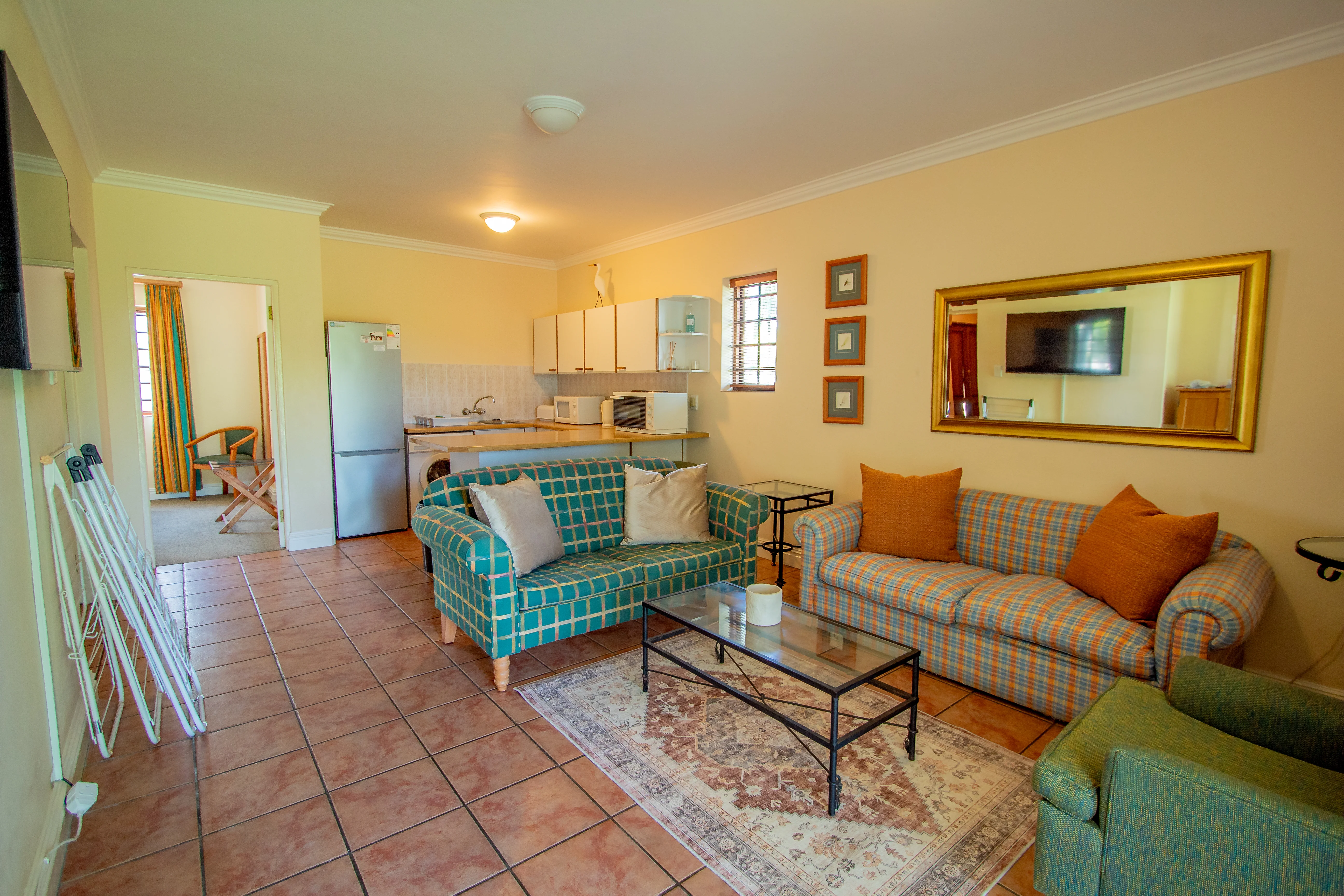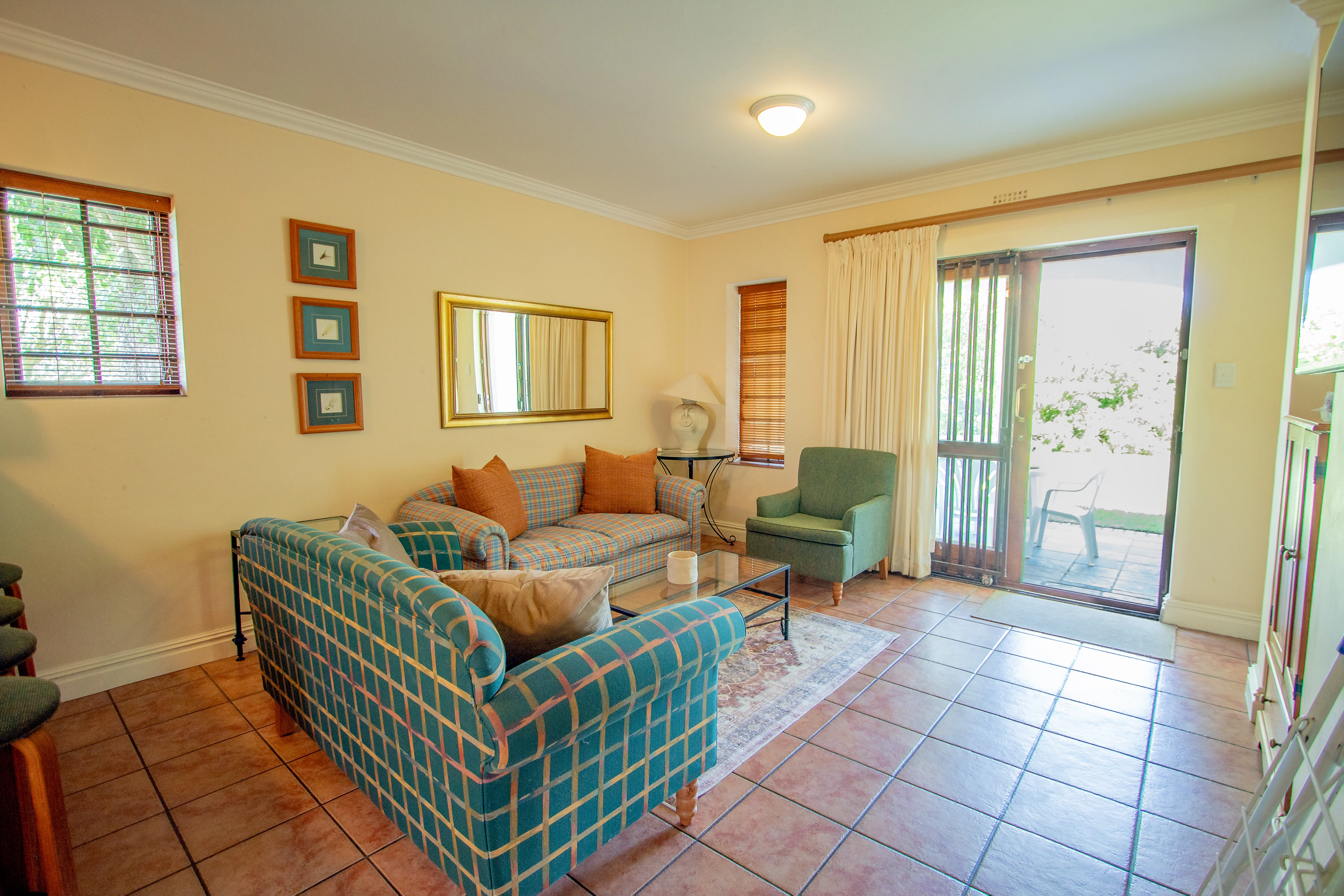 Step into a relaxed open-plan living space with comfortable seating, an HD Smart TV (streaming ready), and sliding doors opening onto a sunny Weber braai patio with outdoor dining furniture – perfect for sunset views over the surrounding greenery, with the river just beyond the thicket of bush in front of the apartment.
