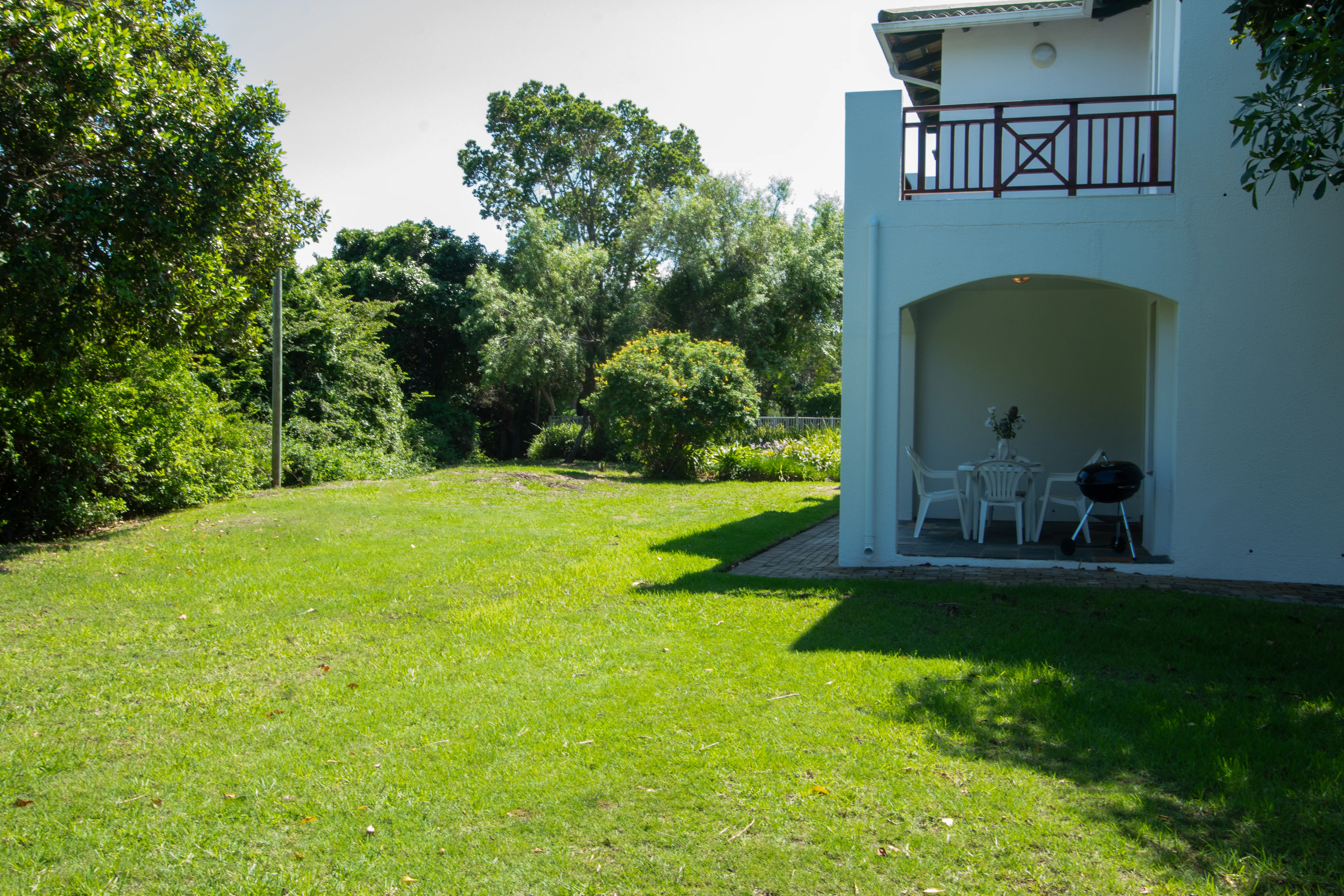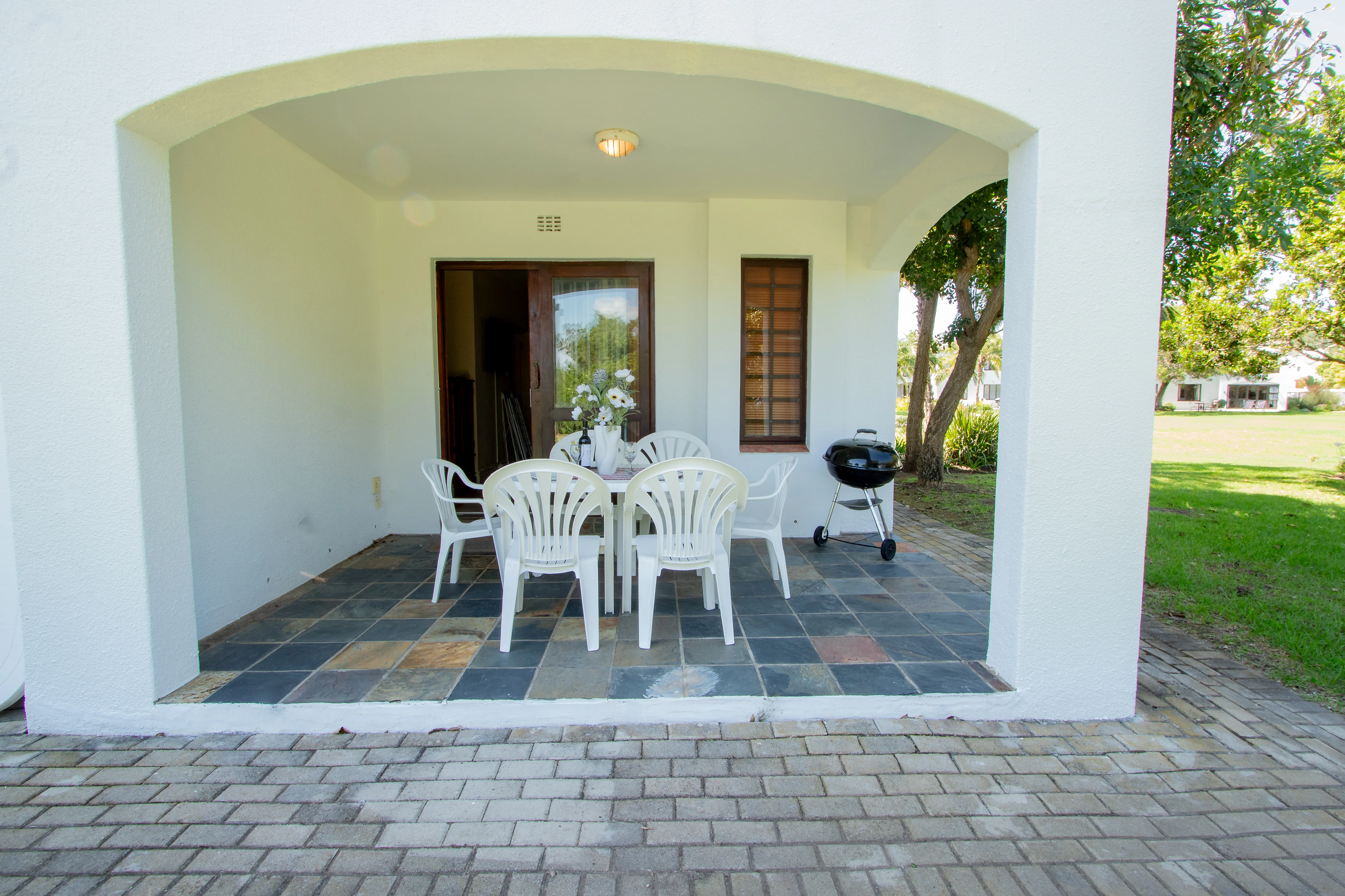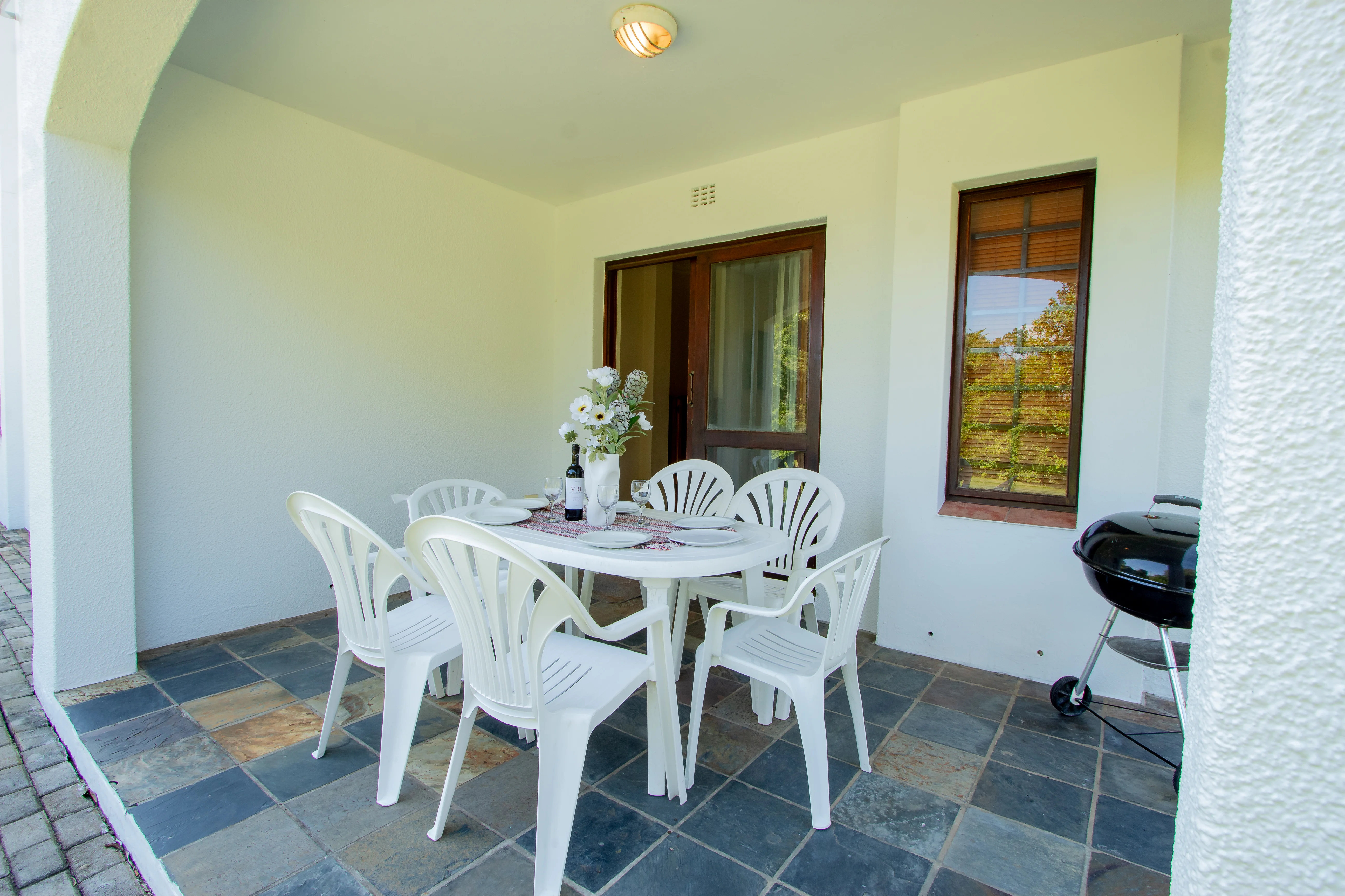 The apartment offers a small kitchen, open-plan living area, and a private patio with outdoor furniture and a Weber braai.